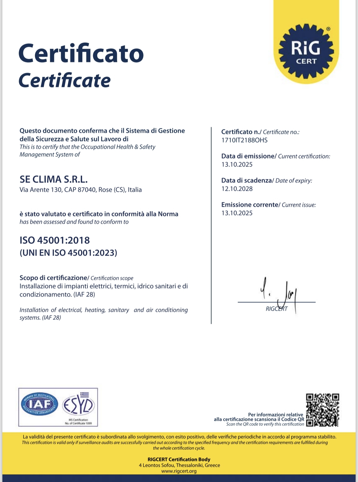 L’organizzazione SE GROUP è dotata di CERTIFICATO F-GAS IMPRESA per i servizi di installazione, riparazione, manutenzione o assistenza, smantellamento di apparecchiature fisse di refrigerazione e condizionamento d’aria e pompe di calore fisse con dimensione massima del carico senza limiti in kg.